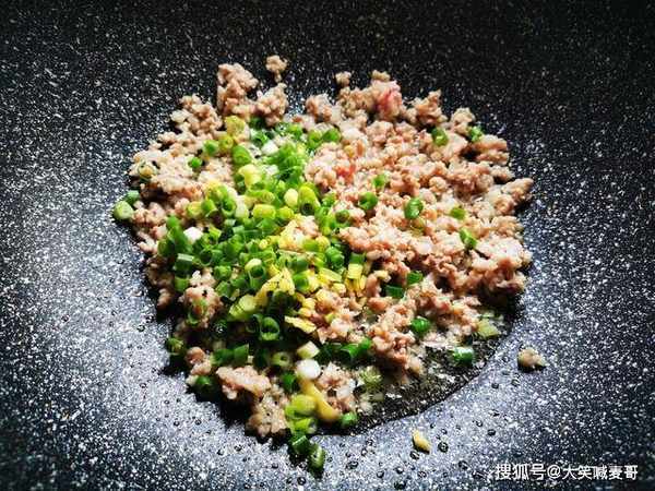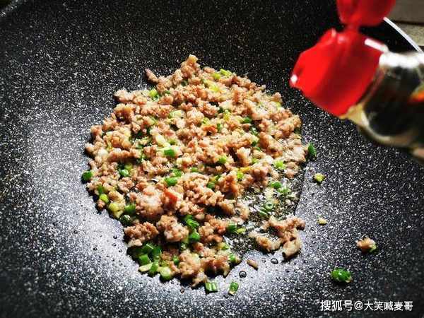 5、这样准备工作就做好了,接下来我们把炒锅预热,倒入适量的食用油,放入剁好的肉末翻炒到发白,加入适量料酒,接着倒入葱末和姜末炒出香味。