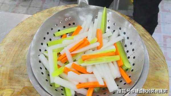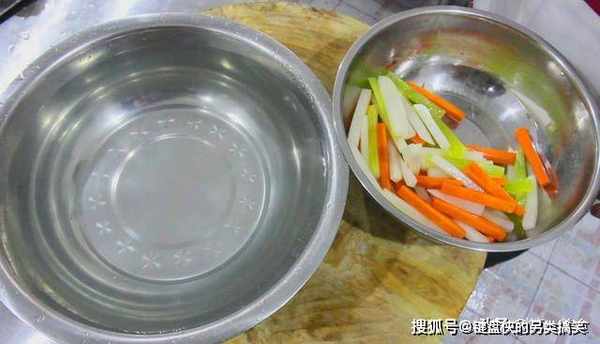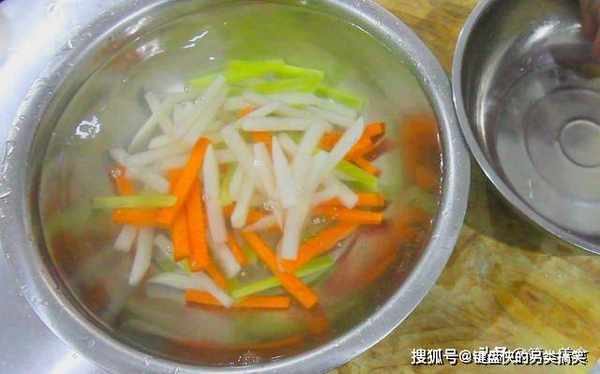 我们把腌了10分钟的萝卜条青笋条在清水中多冲洗几次,然后,在水管下,用活水冲洗几分钟。
