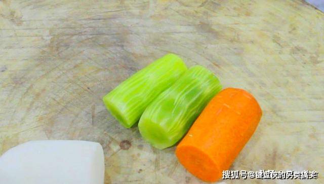 现在我们来准备一下食材,食材很常见,就是胡萝卜,白萝卜,青笋这三样,白萝卜一定要用白色的,不是青色的那种。