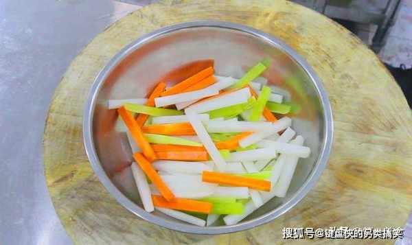 把胡萝卜,白萝卜,青笋全都洗净削皮以后,切成0.7厘米左右的方条。