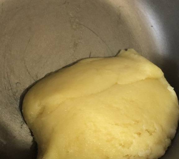 离火,倒入低筋面粉,搅拌至无颗粒。重新再小火加热至水份蒸发。