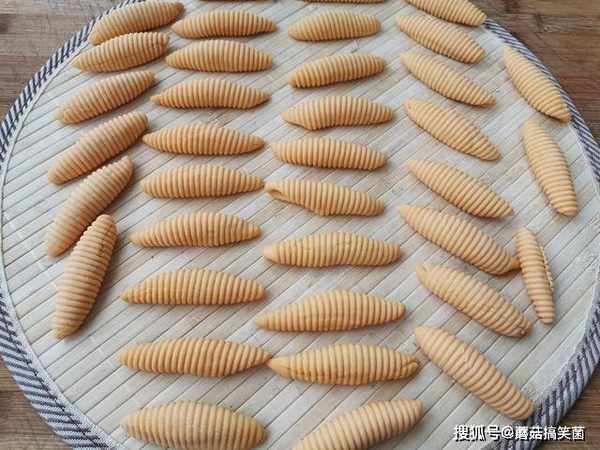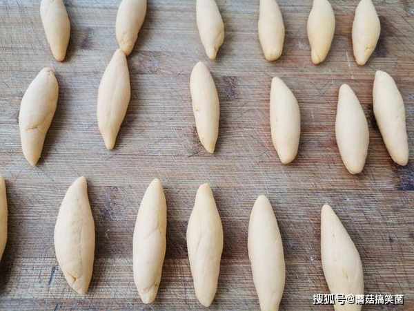 4、揉好的面不用醒发,直接放在案板上揉搓,搓成长条,分成大小均匀的面剂,把每一个面剂搓成中间粗两头细的圆柱体。
