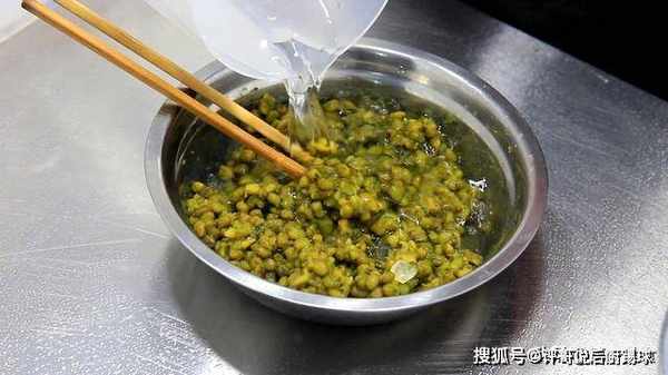 十五分钟以后,把煮熟的绿豆取出来,趁热加入20克冰糖搅拌均匀,喜欢原汁原味的朋友、冰糖可以不放。再添加适量的凉开水或者矿泉水,水量以没过绿豆为宜。