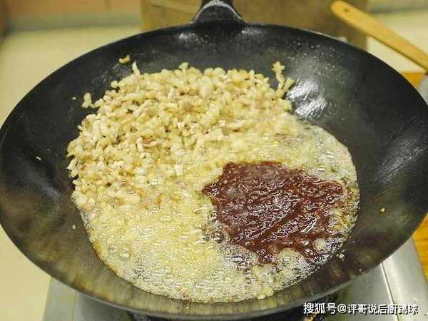 2、两勺豆瓣酱、两勺黄豆酱、再加进去三勺甜面酱,用料酒搅匀备用。锅烧热多加点油滑锅防粘,滑好锅把热油倒出来重新加凉油。先放五花肉进行翻炒,把里面的肥油煸出来。把肉里的水分炒出,肉沫炒的焦黄后面做成酱,口感才会更有层次感。把肉扒到一边倒入准备好的炸酱,先把酱炒出红油和香味再和肉掺匀。