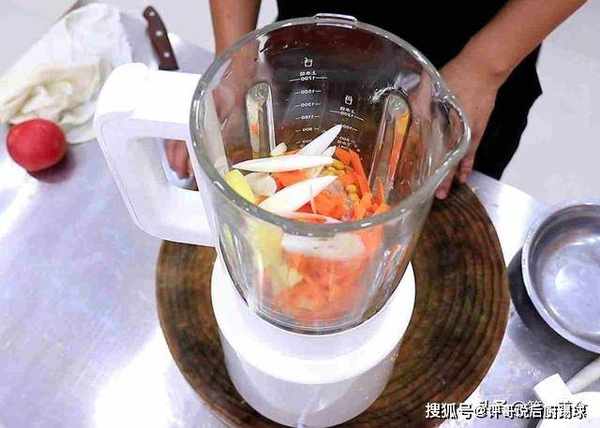 把大葱、生姜、胡萝卜切片,然后和瘦肉块、鸡肉块一块放在料理机里打碎,条件允许的话也可以放点玉米粒,增加一丝丝的香甜。