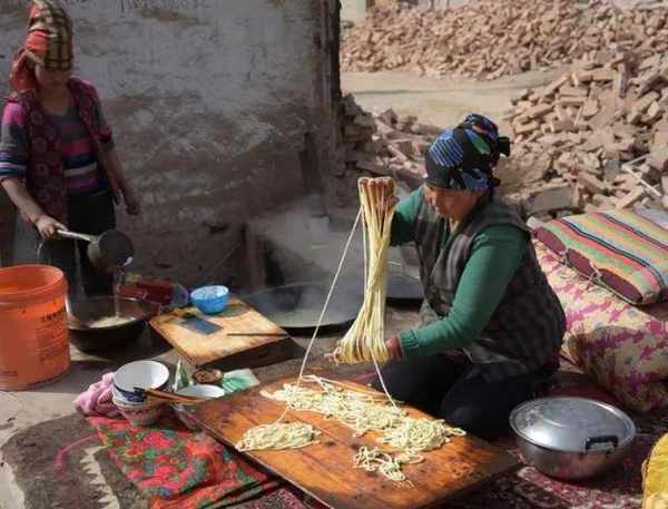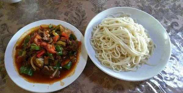 时间长了我终于明白了,那是当地人对于拉条子的一种传统称谓,也就是新疆拌面里面的面。在她家的饭馆里,她的大儿子就是面匠。不过只负责和面,拉面就是老板娘和她那个负责打杂的大女儿,二女儿负责端盘子、招待客人。大儿子平常就是负责炒菜,一家人就撑起了这个小饭馆。