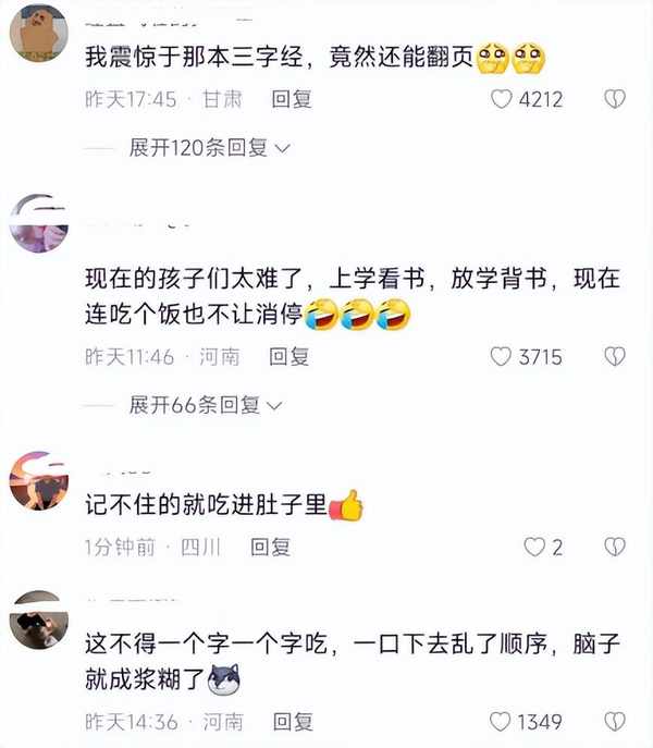 还有把古诗词印在面条上的,学生一边吃面条一边能看古文,比看下饭神剧更有教育意义。看得多了也会形成潜移默化的影响,大部分家长表示支持,只要食品安全方面没问题就好。还有网友想让食堂阿姨多做点,这样的馒头和面条学生多吃点,就不怕肚子里没有墨水。