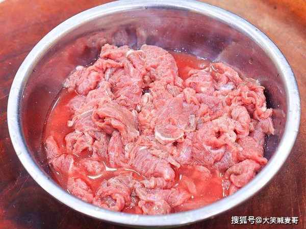 准备一块牛里脊肉,顶着纹理切成均匀薄片,倒入一罐啤酒抓揉出血水,然后控出血水,加入一个蛋清用手抓匀,再抓入一小把淀粉锁住肉片中的水分,再淋入一点植物油继续抓匀腌制10分钟。