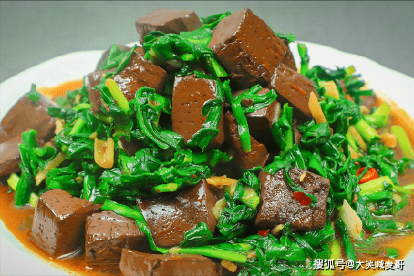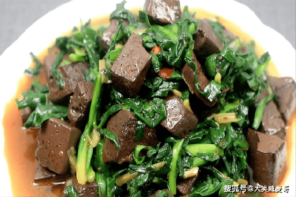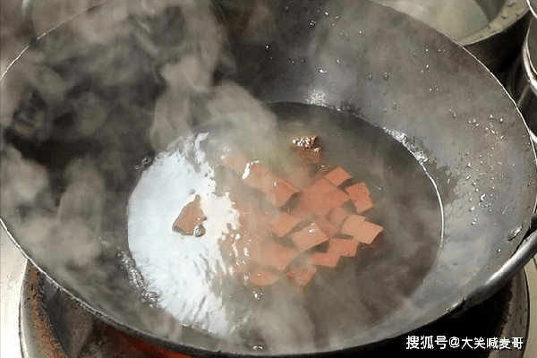 锅内烧水,鸭血直接冷水下锅,锅中加一勺食盐入底味,再倒入少许料酒去腥。等水烧开以后,用勺子撇去锅中的浮沫,然后把鸭血倒出来用清水冲洗干净,控水备用。