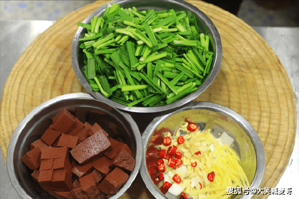韭菜一把摘洗干净,然后切成均匀小段。准备鸭血一块,切成2厘米左右的方丁。葱白破开切葱花;生姜切成丝;大蒜拍扁切成末;小米椒切成圈;放在一起备用。