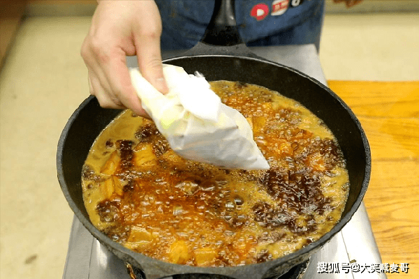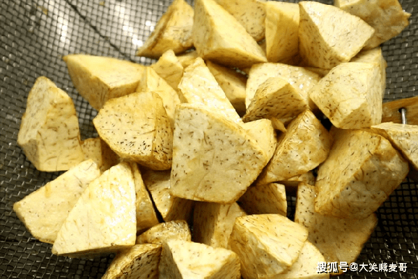 锅中烧油,五花肉五成油温,放锅里面炸一下。炸至表面金黄,就管捞出来了。肉块已经收缩,变得更加紧致了。这样后期炖的时候,能够吸收更多的汤汁。然后趁着热油,把芋头也炸一下。