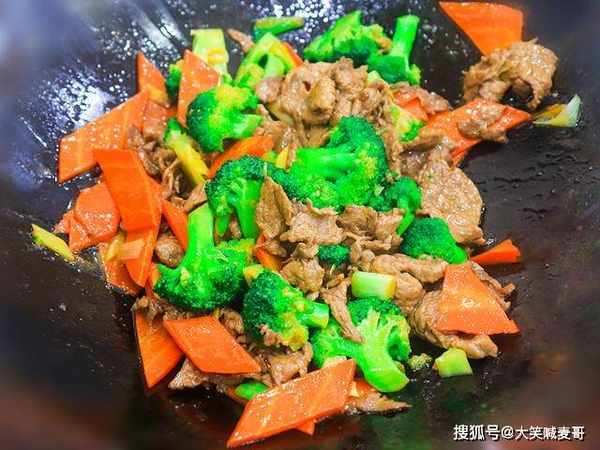 锅内再烧油,油烧热以后放入葱姜一起爆香,倒入西兰花和胡萝卜翻炒均匀,放入控过油的牛肉片,加入食盐2克、生抽5克、蚝油5克增鲜,转大火颠锅翻炒入味后,淋入一点明油提亮色泽即可装盘上桌。