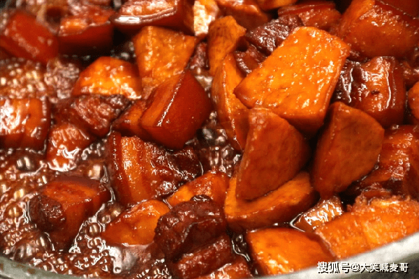 ,直接放铁锅里烙,烙至微微焦黄就可以了。用清水冲洗干净,然后改成三厘米见方的大肉块。芋头切成这种三角块;准备一个炖肉的大料就齐了。