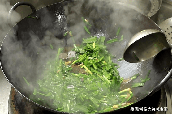 3分钟以后,把韭菜倒入锅中转大火,大约翻炒30秒钟,韭菜返青断生以后,勾入少许水淀粉,翻匀后即可出锅装盘。