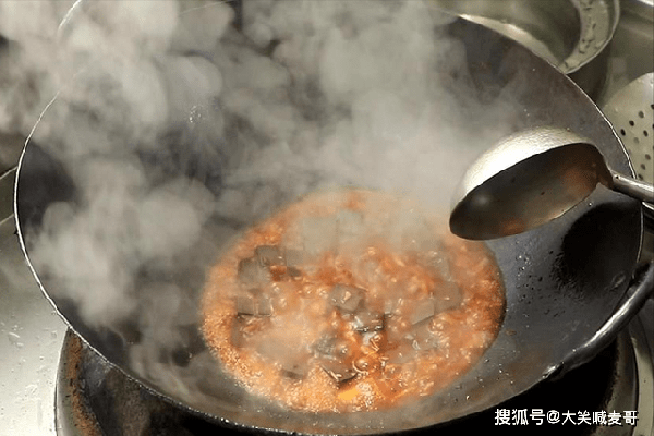 锅里留底油,撒进去一把冰糖,炒碎、熬成糖色。快速颠锅,把颜色炒均匀。沿锅边倒进去一罐啤酒,去腥增香还解腻。再加一点生抽,盐放一丢丢就行了。几块冰糖,增加甜味。