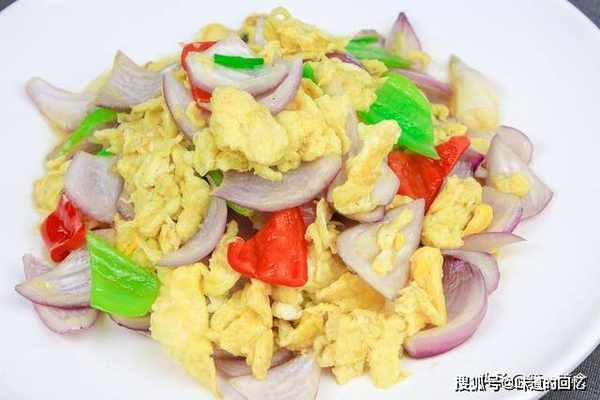 1.首先我们准备一下食材,洋葱一个切成小片抓散以后备用,红椒一片去籽以后切成片,青椒半个去籽以后也切成菱形片,把所有食材清洗干净放入盆中备用。在盆中打入四个鸡蛋,加入食盐1克,给鸡蛋入底味。