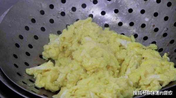 2.食材准备好以后,我们开始烹饪,锅内烧油,油温烧至6成热以后,倒入蛋液,鸡蛋遇热快速凝固,快速的翻炒几下即可盛出,炒鸡蛋不易时间过长容易炒老。
