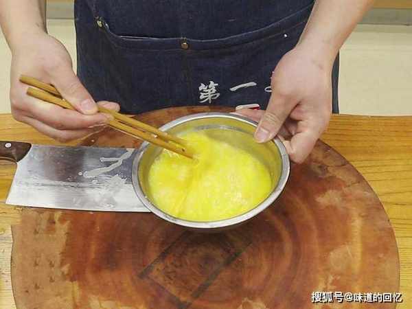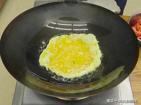 起锅烧油,油热后倒入鸡蛋液。炒鸡蛋时油温稍微要高一些,鸡蛋液下锅就会膨胀起来,才能炒出松软的口感,然后要不停地摇晃锅,让鸡蛋均匀受热。