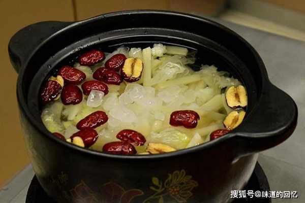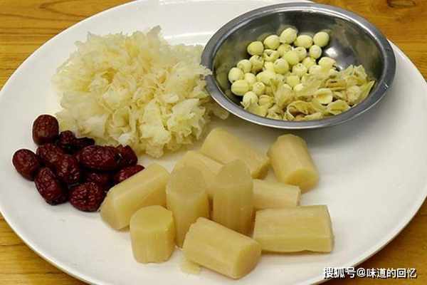 甘蔗肉适量,直接切成小条;银耳一朵、泡发后去除硬根、撕成小朵;干百合和莲子用温水泡软,然后去除莲子芯,以免苦味太重;再准备几粒红枣去核备用。