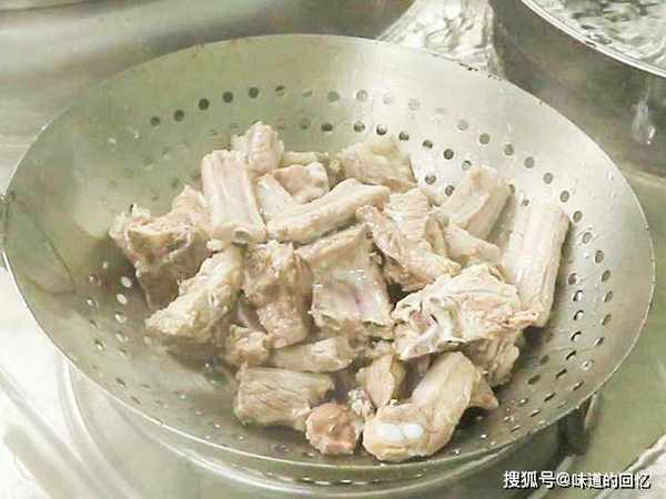 锅内烧水淋入料酒去腥,排骨冷水下锅煮出血沫,大约煮2分钟倒出排骨,清水冲洗干净 沥水备用。