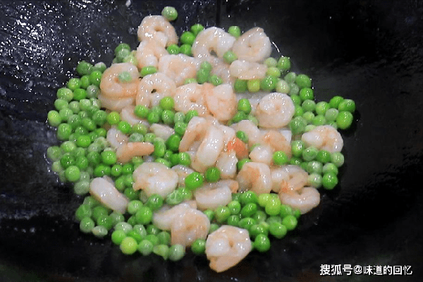 锅内烧油,油温5成热时把控过水分的虾仁、豌豆,和刚刚准备好的料汁一起倒入锅中,开大火颠锅翻炒,食材入味、香味融合以后即可出锅。