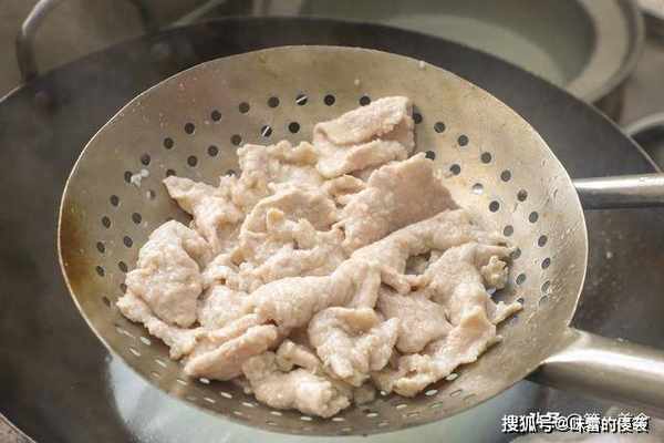 6.锅内再烧水,加入少许植物油,水烧开以后起锅或者开小火,把肉片依次放入锅中,防止肉片粘连成坨,不要着急搅动它,保持小火把肉片煮至定型,用勺子轻轻推动防止肉片粘在锅底,滑煮一分钟左右肉片全部飘起后捞出控水。