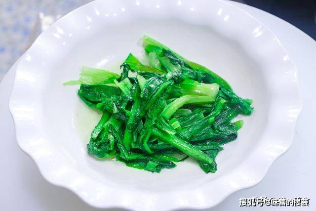 5.食材全部准备好以后,我们开始烹饪,锅内烧水,加入少许食盐和植物油,水烧开以后,把凤尾放入倒入锅中焯水1分钟左右,凤尾变色后倒出控水,然后把控过水的凤尾放入盘中垫底。