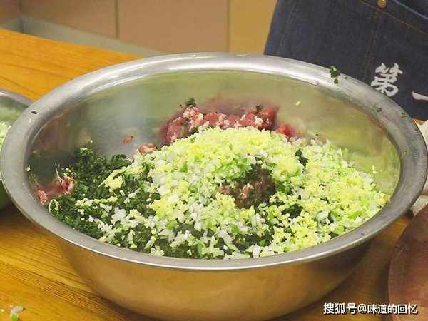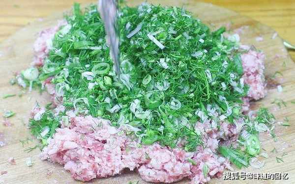 摘洗干净,沥干水分切成碎粒;一小块生姜切成末;几根大葱破开切成葱花;适量的鲜猪肉剁碎备用。