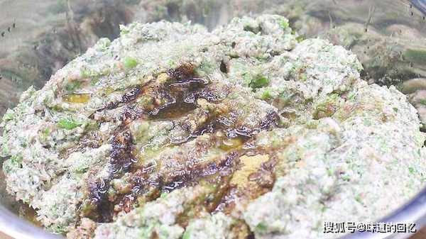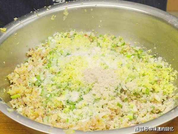 然后把切好的配菜和肉馅都放在盆中,加入食盐、十三香、味精、胡椒粉、鸡粉、生抽、老抽、料酒、葱油和芝麻香油,顺着一个方向搅拌摔打,一直把肉馅搅至上劲成团即可。