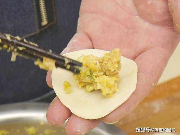 饺子皮上放上馅料对折,用虎口和大拇指摁压成元宝状的水饺。