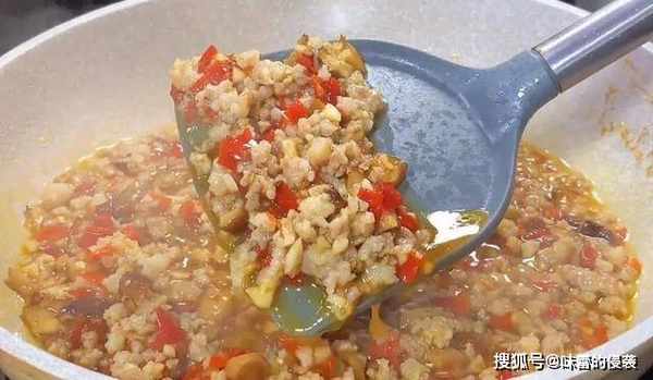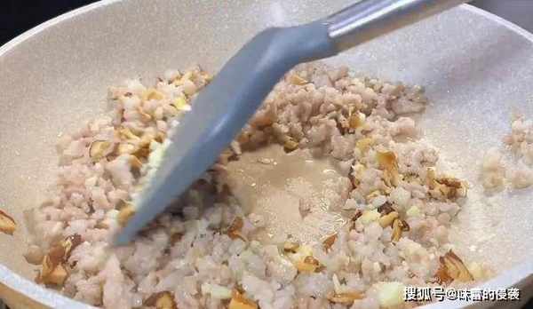 6.另起锅烧油,油热倒入肉末,炒变色,炒出油脂,再倒入蒜末、香菇丁,炒出香味。