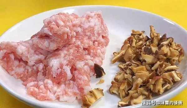 2.准备一块前夹肉,剁成肉末装入盘中备用,接着再切一些干香菇,切成碎末,跟肉末装一起。