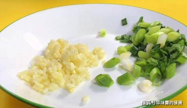 3.大蒜切蒜末,蒜苗切小段,全部切好装入盘中备用。