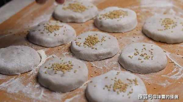 7.用刷子刷薄薄地刷上一层清水,撒上白芝麻,两面都要撒上一层白芝麻,再用手轻轻按压,使白芝麻牢牢粘在面饼上。