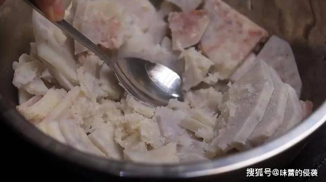 3.时间到,芋头已经蒸熟蒸软,倒入大盆中,用勺子按压成芋头泥。