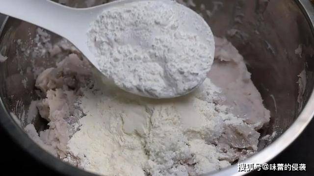 4.加2勺白糖,一勺面粉,一勺糯米粉,用筷子搅拌成絮状。