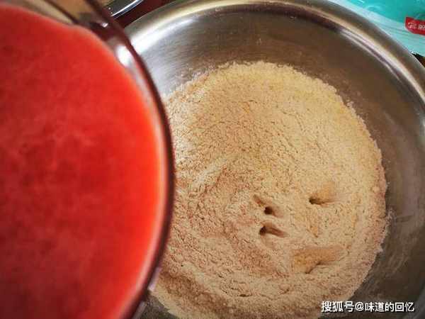 3、接下来我们准备300克的面粉,加入3克的酵母,5克的白糖,白糖可以促进酵母发酵,然后倒入我们过滤好的西红柿汁,先用筷子搅拌成面絮状,接着下手揉成软硬适中的面团,西红柿汁不一定要全部用完,看自家面粉的吸水情况而定。