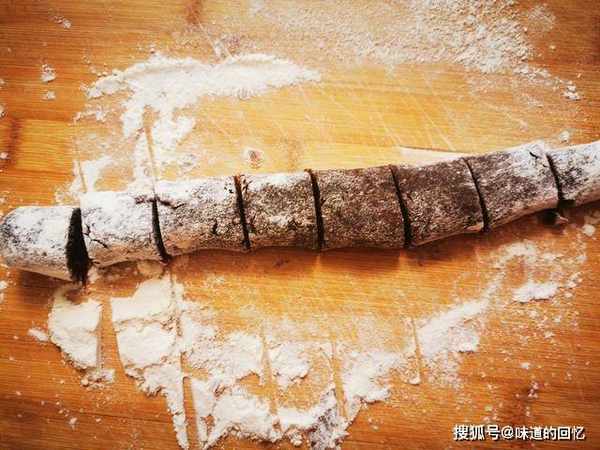 6、我们取出一个小案板,在上面撒些干的面粉,接着倒适量的红豆沙馅,利用面粉把它揉成长条,也下大小均匀的剂子。