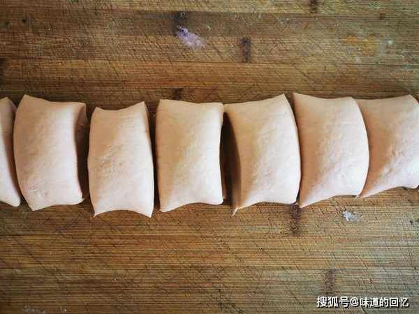 5、醒发好的面团放在面板上多揉搓排气,直到把它揉的表面很光滑就可以了,接着搓成长条,下大小均匀的八个小面剂。