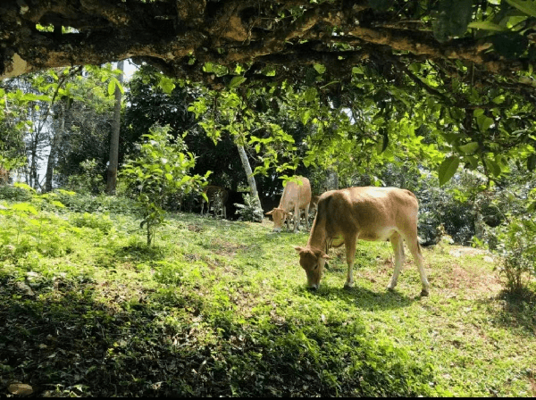 远远望去,三垛山展露出的是千年茶山的雄伟身影,巨大的茶树间,有两头小牛边缓步吃草、边昂首吟唱。