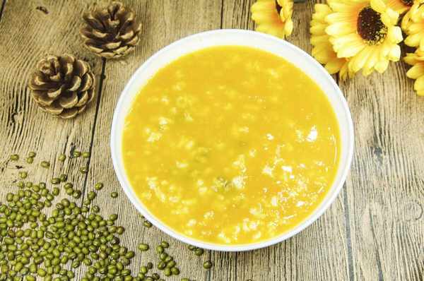 3、把南瓜和大米放入煲中,加入适量清水,煮至大米烂熟、南瓜煮烂。