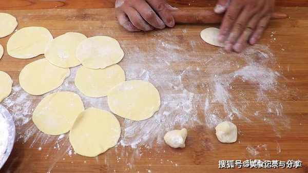 把面剂子摁扁,擀成中间稍厚边缘稍薄的面皮。