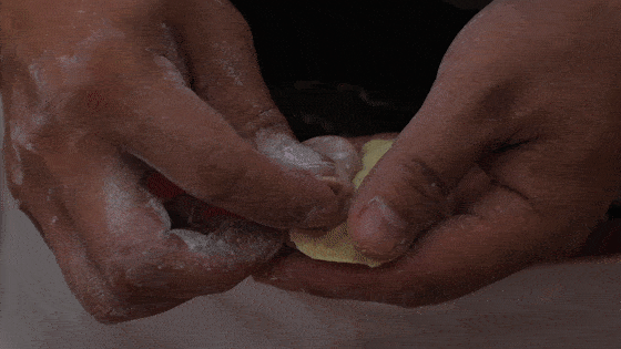 把边缘一点一点的向里折叠,捏出花边。这样煎制时候不容易开裂,也增加美感。