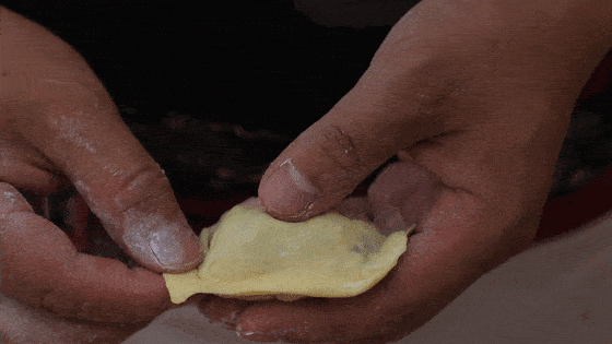 在面皮上放入一勺馅料,把面片对折,用大拇指挤压成饺子的形状即可。