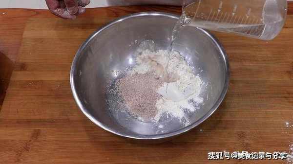 往盆中倒入100克面粉,50克高粱面,用80毫升的温水和面,边倒边搅拌。