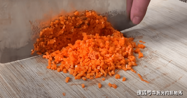 3.胡萝卜削皮切片,再改刀切成细丝,我们为了它的口感更好,继续将胡萝卜丝切细丁。