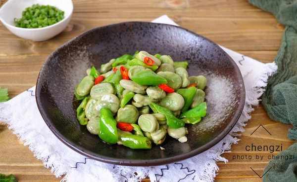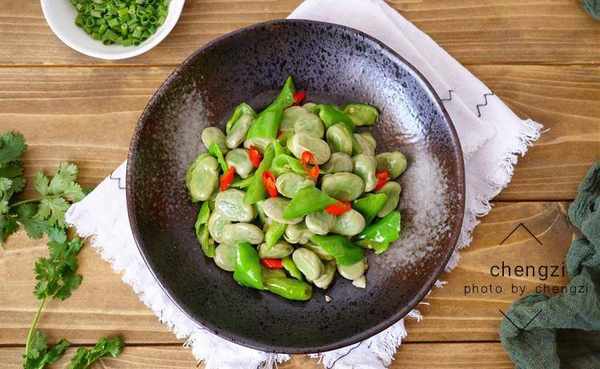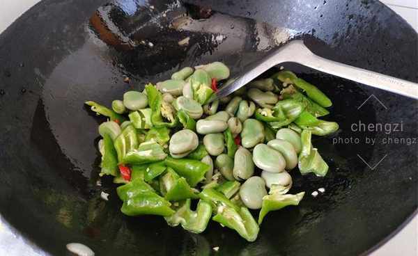 5、加入蚕豆、辣椒,加1汤匙生抽和1小勺盐煸炒一会,至辣椒微微变软关火。