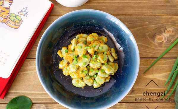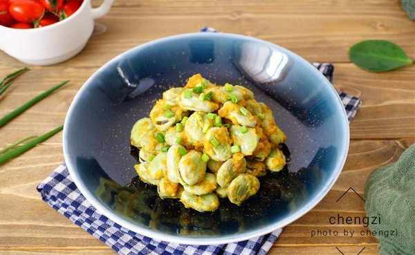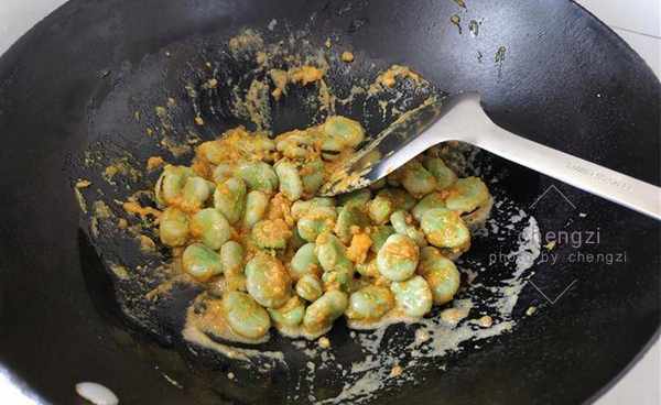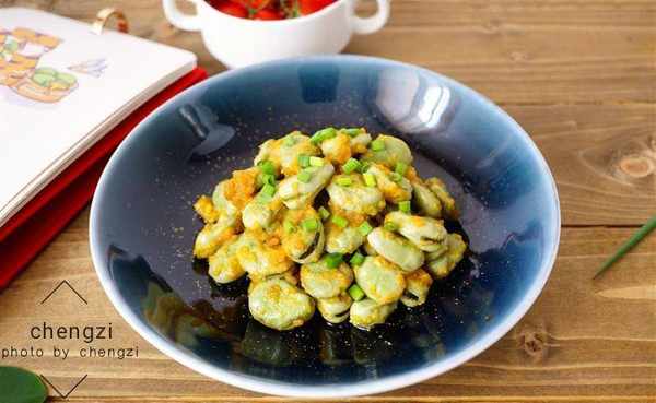 5、最后倒入蚕豆煸炒均匀,盛出后撒上葱花即可,我没有加盐,咸蛋黄的咸味就足够了。
