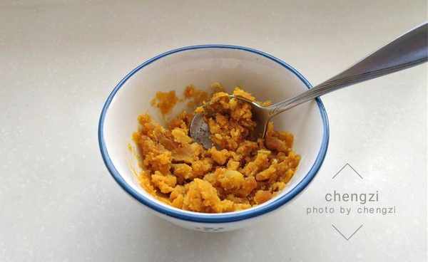 2、准备4个熟咸蛋黄,用汤匙将其压成泥。