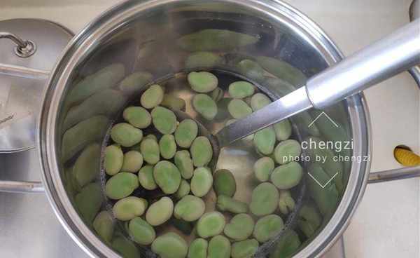 3、小锅加适量清水烧开,放入蚕豆中火煮4分钟将其煮熟捞出。
